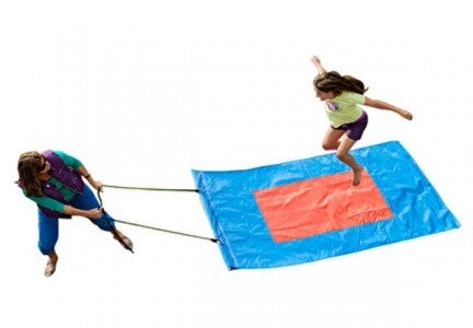Spring met zijn alle omhoog waarna 1 persoon het vliegend tapijt vooruit trekt. Probeer zo samen met jouw team zo snel mogelijk een parcours af te leggen. Maar let op dat je niet langs het vliegend tapijt komt, want dan zullen er strafpunten geteld worden. Zeer grappig om naar te kijken en perfect in te zetten als teambuilding.